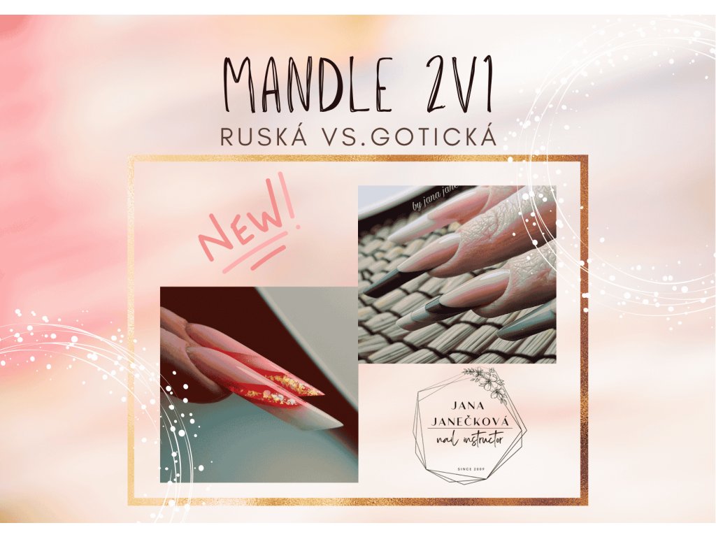 Mandlové tvary jsou v posledních letech stále oblíbenější jak u klientek, tak u nehtových designerek. Ruská mandle - ostré hrany, špičatý tvar, dokonalé linie. Gotická mandle - velmi elegantní a neotřelý tvar, který ruku prodlouží a dodá jí elegantní vzhled.